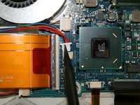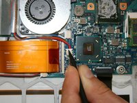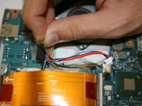 Use the nylon spudger to disconnect the wire (red/blue) plug from the motherboard.