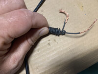 Push the DC power cord through the stress relief collar, starting at the pointy end. Use something stiff, thin and pointy to push it through such as a paper clip. When you are done, pull through about one inch of insulated wire. Tie a knot so the DC power cord can't slip back through the stress relief collar (Figure 3).