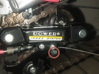 Adjust these screws with the screwdriver until it positions the derailleur in such a way that the front handle (shown earlier) can be used to switch from the highest to the lowest chainrings/sprockets on the rear crankset