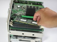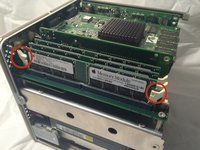 If the Cube has an Airport card installed, it must be removed. This can be accomplished by disconnecting its antenna, and pulling gently on the clear plastic tab on its end. The bracket it is contained in must be unlatched from the frame and rotated out of the way to get to the two optical drive mounting screws beneath it. There is a ribbed cooling plate attached to the hard drive that must be removed before step 7. There is no need to remove the four pillars. Skip step 4. In step 5, don't turn the Cube on it's side. The Airport slot swings out like a door, providing access to the IDE ribbon and power cables to complete step 6. Complete steps 6 and 7 while the cube is upright. You really don’t need to remove all four pillars, or any of them depending on the repair you’re doing. They can be pulled out easily enough, just remove any that get in the way.