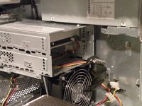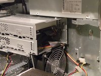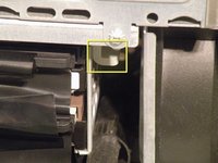 With the ribbon cable clip free, pull this tab towards you, slide the cage up until it hits the platform under the power supply, and pull it away.