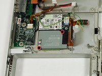 Remove the two Phillips screws securing the AirPort/Bluetooth card to the lower case.