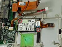 Disconnect the two antenna cables from the airport/bluetooth card (shown in yellow circles) and deroute them from under the other cabling.
