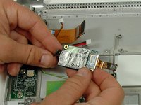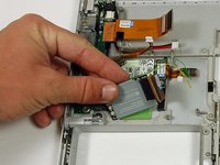 Lift the left side of the logic board and disconnect the modem cable from the underside of the logic board. A spudger is useful for freeing the connector from its adhesive.