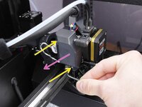 With your free hand, loosen the two thumb screws holding the Hotend in place. Removing the thumb screws is not nessessary. A few turns is enough to get the Hotend free.