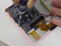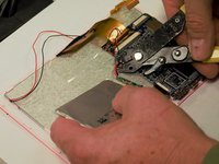 Cut the red and black wires that connect the battery, screen, camera, and speakers to the motherboard.
