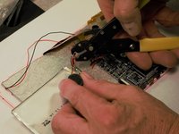 Strip both the red and black wires in the middle with a wire stripper/cutter tool. Do this for all wires that were cut, as well as for the wires on your new motherboard.