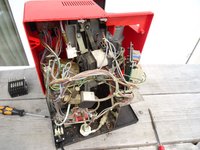 Das Vorderteil hängt jetzt nur noch mit Kabeln an den Anschlussknöpfen des Bedienfelds. Um besser an die Brühgruppe oder das Mahlwerk zu gelangen, genügt es, das Vorderteil etwa 10 cm nach vorne zu schieben. Wenn das nicht reicht, musst du das Bedienfeld befreien.