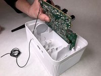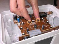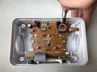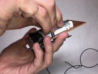 Grab the tweezers and follow the red and black wires leading from the speaker to the motherboard. They will attach to a white casing. Lift the white plug out with the tweezers to disconnect.