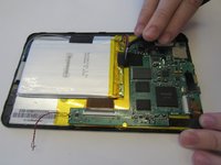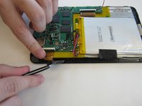 Remove the battery pack by carefully prying the battery back from the front cover. Then, remove the wires connecting the battery to the motherboard at the motherboard using the tweezers.