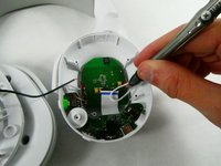 Gently lift the plastic plate away from the housing, with care not to damage the connected wire.
