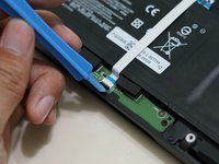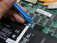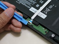 At the top right side of the battery, use the opening tool to disconnect the battery cable from the motherboard.