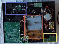 Tilt the housing for loosen the 4 phillips screws at the top (marked yellow).