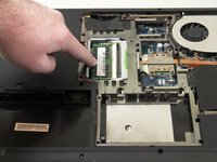 Locate cover on back of laptop, diagonal to battery compartment. Remove four screws securing cover.