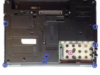 With the bottom of the laptop facing up and the front toward you locate and loosen the two M2.0×5.0 captive screws holding the hard drive bay cover closed.