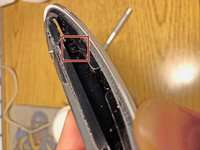 Proceeding with caution, take a small pry tool and pry one of the plastic loops off of its black plastic post. Pry the loop in the outboard direction while applying gentle pressure separating the upper and lower halves of the mouse. The loop should pop off the black plastic post.