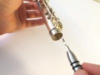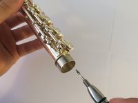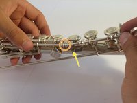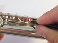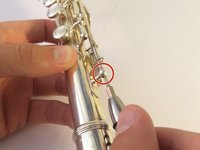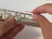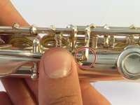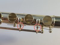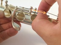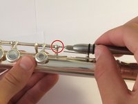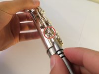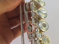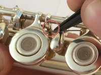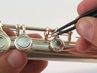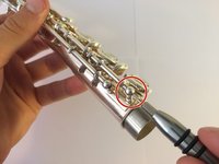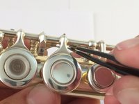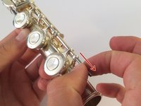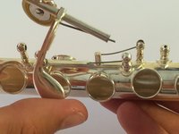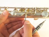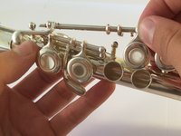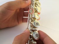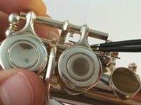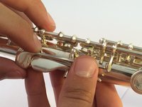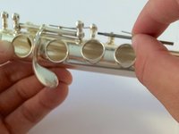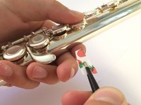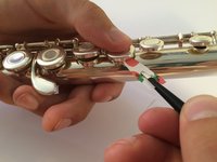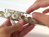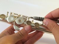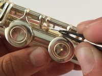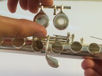 The flute I'm about to show how to repair is a French Model flute (open hole keys). However, this method is applicable to the Plateau Model as well as other types of traditional concert flutes. If the connected keys on your flute aren't synchronized properly, follow step 1 and then skip ahead to step 40. If your flute has sticky keys, after following the first step, skip ahead to step 41. If your key has a missing pad, complete the first step and skip ahead to step 42. If your flute still won't play after completing these steps, then continue from step 2. Based on the location of the key needing repaired, some steps may not be necessary. Follow the instructions contained in the guide for details.