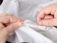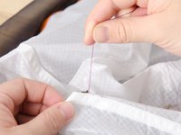 Take a small stitch, going in and out of the material, on the other side of the tear, directly opposite of the stitch you just took.