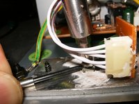 These are the five contacts that need to be desoldered. Apply some flux on the wick and heat up the solder with the soldering iron.