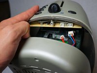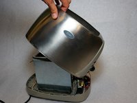 Using the Phillips-head #2 screwdriver, unscrew the three 1cm Phillips-head screws on the plastic base of the toaster to separate the outer metal shell from the plastic base.