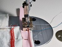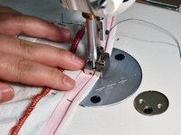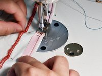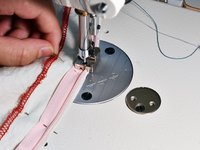 Position the zipper foot on top of the fabric 1/8th of an inch from where the zipper tape meets the garment.