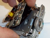 The camera should now be in two parts. Set the lens half off to the side and continue working with the side containing the flash.