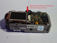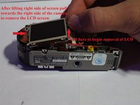 After screw is removed lift right side of LCD screen straight upward and pull to towards the right side of the camera. (Picture 2)