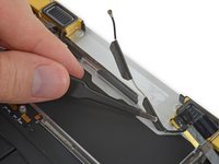 Using tweezers, carefully peel up the tape securing the right antenna cable to the lower case.