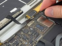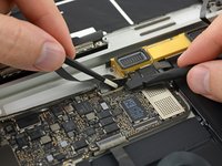 Use tweezers to peel back the tape covering the trackpad cable ZIF connector.