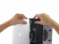 Wedge your fingers between the upper case and the lower case, starting from the rear of the MacBook between the hinges.