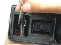 Use a thin shaft screwdriver and unscrew the two indicated screws within the film compartment.