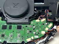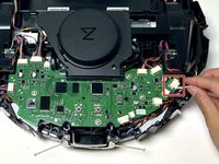 Using moderate pressure, squeeze and pull on the four-wire connector to disconnect the battery from the robot vacuum.
