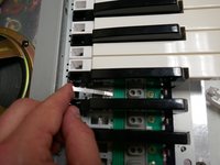 Open the lid by holding both sides of the upper chassis. It should hinge backwards and be stopped by a green grounding cable.