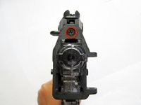 Using a Phillips #1 screwdriver, remove the two 8mm screws above the hand guard on both sides of the gun.