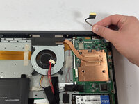 Gently remove the tape holding the battery's cord to the motherboard, followed by the tape in the middle of the cord.