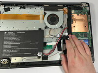 Gently remove the tape holding the battery's cord to the motherboard, followed by the tape in the middle of the cord.