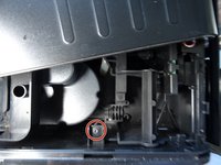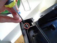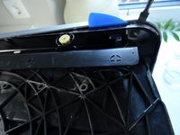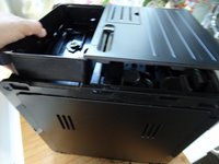 Hebe die Oberseite nach oben heraus. Es hakelt ein bisschen, vor allem unter dem noch vorhandenen Zierrahmen an der Seite mit der Serviceklappe. Benutze ein Plastikhebelwerkzeug und raste die Oberseite behutsam aus.
