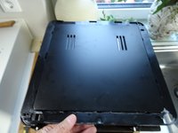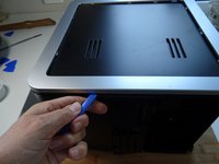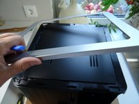 Lege die Maschine auf die Seite, so dass der Boden zu dir zeigt. An der Unterseite kannst du mit einem Metallwerkzeug beginnen, die Zierblende loszuhebeln. Verwende an den anderen Seiten nur Plastikwerkzeuge, damit der Rahmen nicht beschädigt wird. Die Rasten lösen sich nach und nach mit lautem Knacken.