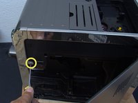 Das obere Teil des rechten Metallrahmens ist etwas versteckt mit zwei Torx T10 Schrauben befestigt. Du erreichst die hintere der beiden durch die Öffnung in der hinteren rechten Ecke. Lockere die Schraube ein wenig, so dass du den Metallrahmen ein Stück nach außen ziehen kannst.