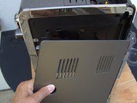 Die Wartungsklappe ist am hinteren senkrechten Stück des Metallrahmens eingehängt. Hebe alles nach außen weg.