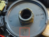 Setze das graue Zahnrad beim Einbau so ein, dass die Nullmarkierung auf die Achse des weißen Zahnrads zeigt.