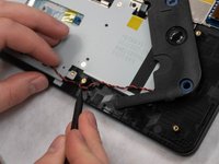 Using the nylon spudger, release the black and red wires that connect the two speakers.