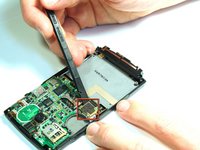 Use the tweezers to unsnap the connection between the motherboard and the speaker. The speaker is attached to the front casing.