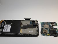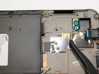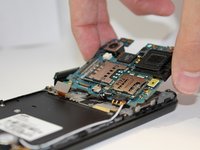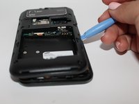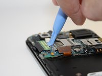Use the plastic opening tool to detach the two tabs connecting the motherboard to the base of the phone.