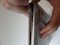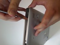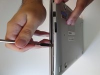 Starting at the center front of the laptop, insert the metal spudger between the keyboard panel and the bottom panel, separating the bottom panel from the laptop.