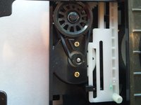 Once the tray is opened, locate the rubber band, as noted by the blue box, and remove and replace it by pulling it out of the mechanism