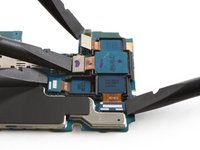 • In line with other recent Samsung phones, the battery squats in a little pit of glue-lined sadness with no pull tabs, but we quickly set to work digging it free with heat and a plastic card for some leverage.