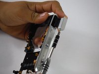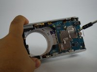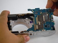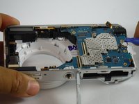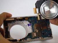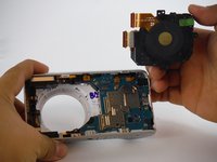 After removing the screen and battery to access to the inside of the camera, take note of the two main assemblies inside-- the lens apparatus and the main motherboard. The lens assembly is on the left hand side.
