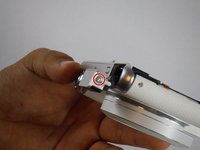 Now with the camera completely disassembled, take the silver trim with the zoom and find the two screws holding the zoom-button assembly.