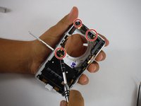 While holding the camera, take note of each screw holding the screen to the main chassis of the camera.
